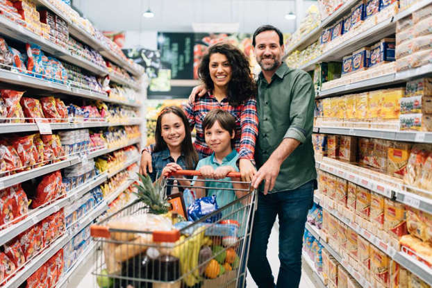 A joyful family of four poses proudly in the heart of our bright, welcoming supermarket aisles—mom and dad beaming with arms around their smiling kids, while the shopping cart overflows with fresh fruits, vegetables, tropical pineapples, snacks, cereals, and everyday essentials.