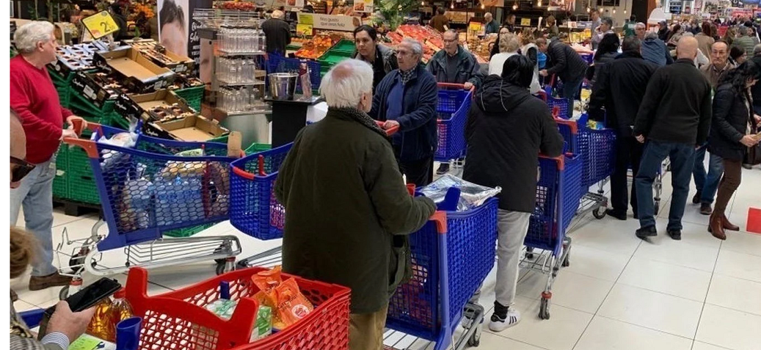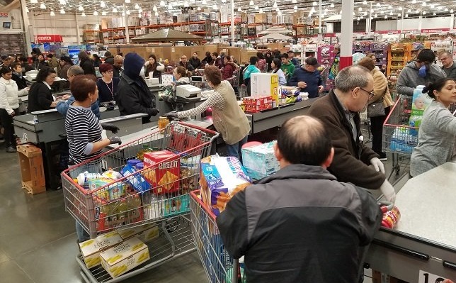 The energy is high in our expansive grocery section as shoppers line up at multiple registers, carts loaded with family essentials, holiday treats, bulk buys, and everyday groceries. From parents with kids to couples and individuals, everyone is stocking up efficiently while friendly cashiers keep things moving smoothly under bright lights.