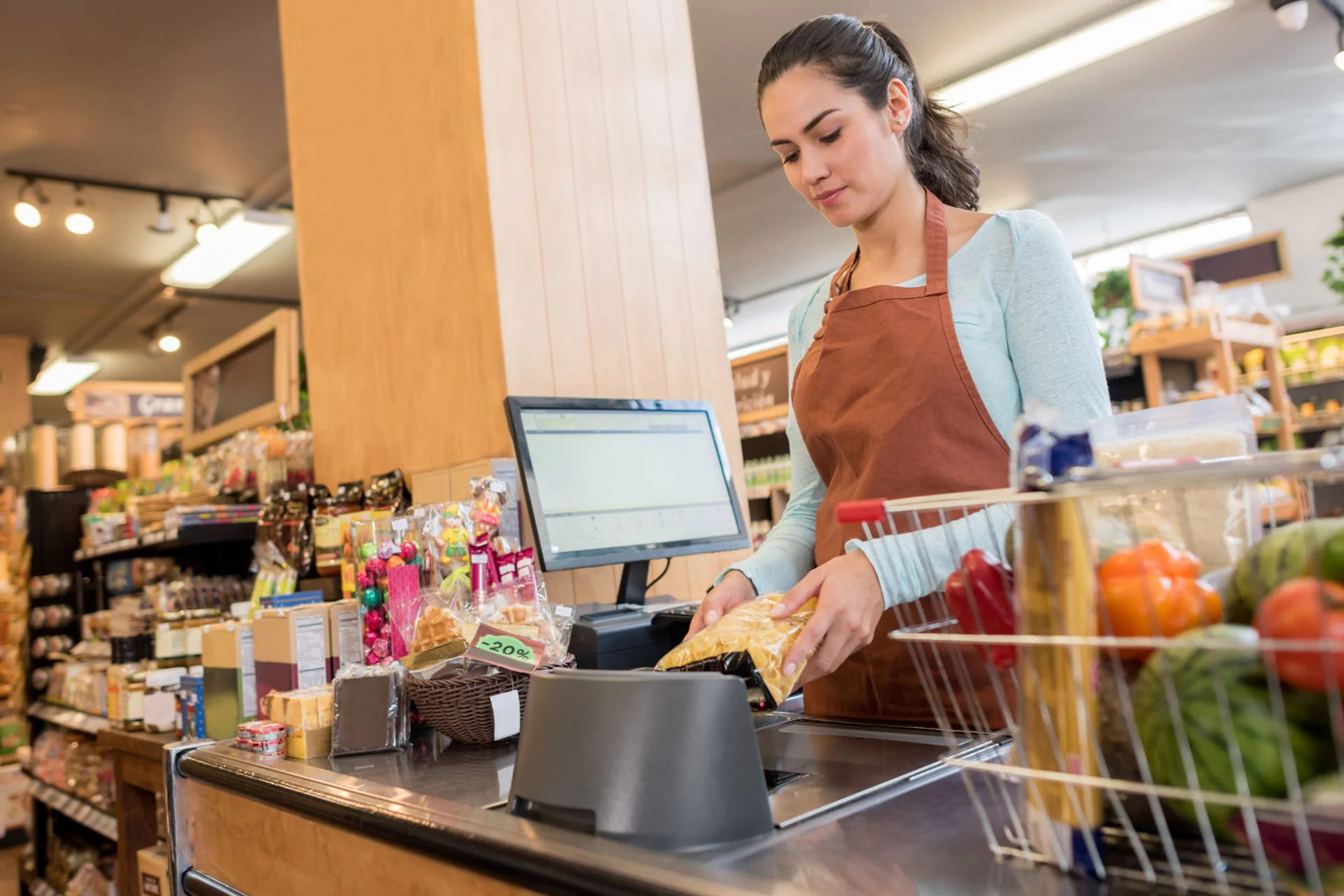 A friendly cashier carefully scans items at the register, handling fresh produce, pantry staples, and today's special deals with care and efficiency. Surrounded by the warm, inviting atmosphere of our grocery section, every purchase feels welcoming and convenient—whether you're grabbing quick essentials or stocking up for the week.