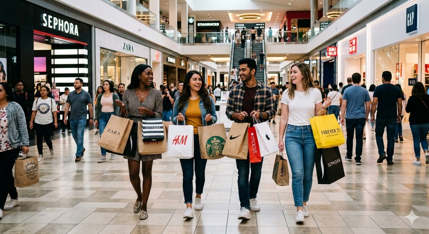 Experience the vibrant energy of Vancouver shopping destination! This stunning aerial view captures the multi-level atrium alive with shoppers exploring luxury boutiques, exciting pop-up kiosks, and elegant central displays. From families strolling the walkways to friends catching up amid the glow of high-end stores and sparkling features, every corner buzzes with excitement, style, and endless possibilities.